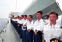 中国海军海上隆重祭奠“海空卫士”王伟烈士活动,二十六日中午在海南省三亚市附近海域隆重举行。509号导弹护卫舰官兵脱帽肃立,为英雄王伟送行。中新社图 张全跃 摄