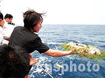 中国海上祭奠“海空卫士”王伟烈士活动二十六日中午在海南三亚临近海域隆重举行。船舷一侧,哭得像个泪人的阮国琴把花环抛进大海,祭奠自己的丈夫。中新社图 张全跃 摄