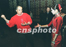 二十六日芭蕾舞剧《大红灯笼高高挂》的彩排间隙,张艺谋给演员说戏。中新社图 史利 摄