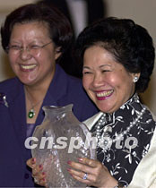 香港立法会5月3日晚为刚刚辞去政务司司长的陈方安生举行“惜别晚宴”,立法会主席范徐丽泰代表立法会向属“双鱼星座”的陈方安生赠送“水晶双鱼”。中新社传真 任晨鸣 摄