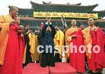 辽宁省鞍山市著名旅游胜地“玉佛苑”的佛乐队,在“五·一”假期为前来烧香拜佛的信众和游客表演隆重的送香仪式,以增加苑内的气氛。据统计,五月以来每日都有数千人到此参观游览和烧香拜佛。中新社记者 王丽南 摄