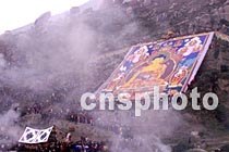西藏拉萨市藏族市民十一日开始欢度当地盛大民族节日雪顿节,清晨在哲蚌寺举行了晒佛仪式。中新社图 赵伟 摄