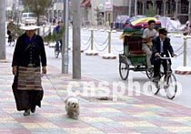 一位牵着狗的藏族老大娘,十三日清晨悠闲地在拉萨市新铺上彩色地砖的人行道上散步。这条街是江苏省支援西藏建设的项目之一,被命名为”江苏路“。中新社图 赵伟 摄
