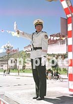 西藏首府拉萨市的第一支女子交通警察队,十五日正式上岗,队长索朗德吉在布达拉宫前的岗台指挥交通。这支女子交警队的七名队员中有六名是藏族。中新社图 王鲁平 摄