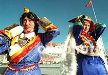 被称为“阳光之城”的拉萨市,冬天仍阳光灿烂。两位穿着盛装的藏族妇女在布达拉宫前细心打扮,准备照相。中新社图 吴新华 摄