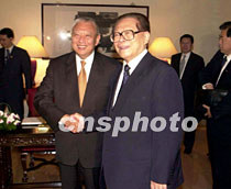国家主席江泽民五月九日出席香港特区行政长官董建华举办的午宴上与董先生亲切握手。中新社传真 任海霞 摄