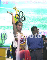 扮演唐朝反弹琵琶的飞天女,十日在中国西部甘肃省的展台前起舞,为北京国际科技博览会的绿色工程助兴。中新社记者 贾国荣 摄