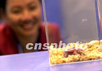 一只小裸鼠身背人造组织耳,十日在北京国际科技博览会上成为观众的宠物。这是中国高科技功关项目组织工程的成果之一。中新社记者 贾国荣 摄