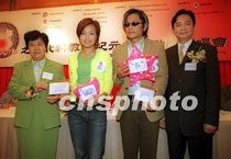 歌星容祖儿、王杰11日在香港出席「星火行动」之粤北科教新纪元助学演唱会记者会。演唱会将于5月26日晚上假广东韶关举行,主要筹募善款让落后边远山区的儿童受惠。广东省韶关市市政府副市长杨春芳女仕(左)颁发委任状予星火爱心大使容祖儿、王杰。中新社传真 邓庆乐 摄