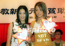 歌星欧倩怡、何韵诗11日在香港出席「星火行动」之粤北科教新纪元助学演唱会记者会。中新社传真 邓庆乐 摄