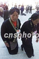 西藏自治区七届人大四次会议13日拉萨举行,出席会议的藏族妇女代表手挽手步入西藏人民大会堂。中新社记者 满会乔 摄