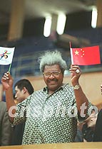 拳坛著名经纪人唐·金日前对北京拳击馆进行考察,他挥舞着中国国旗和申奥标志,表示愿为北京申办2008年奥运会出力。中新社图 郑萍萍 摄