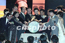 香港各界支持北京申奥暨世界三大男高音紫禁城广场音乐会酒会,五月二十一日在香港举行。中央政府驻港联络办副主任王凤超、外交部驻港特派员吉佩定等出席。中新社传真 任海霞 摄