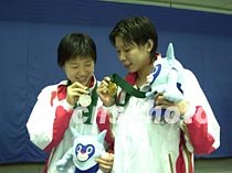 在第三届东亚运动会女子二百米蛙泳比赛中分获金、银牌的齐晖和罗雪娟,在领奖台上比谁的牌子亮。中新社记者 陶光雄 摄