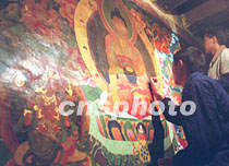 西藏拉萨大昭寺内的壁画正在进行整修,工人在不影响游客参观的情况下加紧施工。中新社记者 满会乔 摄