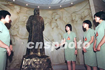 一群年青的服务小姐三十日在北京中华世纪坛即将开幕的“中国共产党建党八十周年大型展览”上演练如何讲解共产党的历史。图为姑娘们围着中国共产主义先驱李大钊的铜像进行训练。中新社记者 王丽南 摄
