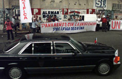 图文:在巴拿马遇抗议 陈水扁攻击"一国两制" 2001年5月31日 13:59 ![]() 陈水扁赴巴拿马立法议会演说,在他乘坐的车辆驶进会场时,场外众多当地华人华侨和当地民众手持支持中国和平统一及支持一国两制等标语,并高呼反“台独”口号。(“中央社”图 孙仲达摄) 中新网香港5月31日消息:台北讯,北京时间昨天上午,陈水扁在前往巴拿马国会途中,遇到一批手持“一国两制”﹑“和平统一”标语的示威抗议者。陈其后在演讲时突然脱稿大肆攻击“一国两制”,声称“在台湾的中华民国”不是任何国家的一省或一部分,公开推销“两国论”。 陈水扁前往巴拿马国会途中,巴拿马和统会的成员在广场高举“巴拿马人民支持两岸和平统一”﹑“一个中国”布条,引起一阵骚动。 其后,陈水扁前往巴拿马国会,同一批人又在国会前高举白布条,他们除了上午的诉求以外,又多加了“一国两制”。陈水扁在国会演讲时,突然脱稿放话,大肆攻击“一国两制”,竟指台湾是中华人民共和国的一省是“扭曲事实”,并且声称“在台湾的中华民国”绝对是“主权独立的国家”,不是别人的一省,或是人家的一部分。 另据英国《金融时报》网络版报道,巴拿马对正在访问的陈水扁开出“外交”支持的新价码。巴拿马副总统巴山说,他希望台湾增加从巴拿马的进口并给它更多投资,依此作为该国外交上承认台湾当局的价码。 去年巴拿马对台湾出口增长一倍,达到一千四百万美元,但进口台湾产品二千八百万美元。巴拿马议长科提佐称陈水扁的访问成功与否要看巴拿马出口是否增加、台湾在巴拿马投资的质量、投资所带来的就业以及台湾使用巴拿马的国际服务。陈水扁则宣称,“你们可以放心,我们将鼓励和动员我们的商人投资巴拿马。” 但并不是所有巴拿马人都给予同等响应。巴拿马的十万华人中很多人支持中国大陆,很多反对党政治家要求同台湾断绝外交关系。 |