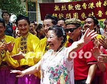 五月末在新疆吐鲁番考察的香港代表团被新疆民族歌舞吸引,华懋集团主席龚如心装扮独具一格跳起舞来。中新社图 陈国华 摄