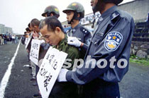 中国安徽省繁昌县公检法部门三十日召开“公捕公判”大会。十一名犯罪分子在 六十余名荷枪实弹的警察和武警战士押解下进入体育场并被公开宣判。中新社图 吴芳 摄