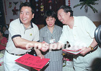 北京市儿童福利院名誉副院长、著名笑星姜昆(左)日前在北京清河接受各届人士为北京市儿童福利院的捐款。中新社图 史利 摄