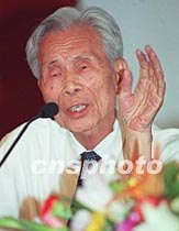 中国当代著名画家吴冠中一日在清华大学举办的“艺术与科学”国际学术研讨会上,就“艺术与科学之间的关系”等问题接受新闻媒体采访。中新社记者 张勤 摄