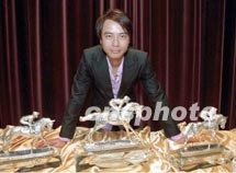 歌星李克勤1日在香港出席「2000/01年度香港赛马会冠军人马奖」记者会,与多个精致马匹奖座合照。中新社传真邓庆乐摄