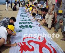 “华夏故土地图”推广、海南取土仪式二日在三亚南山举行。在现场还进行了 一场声势浩大的“支持北京申奥签名活动”。中新社图 王辛莉 摄