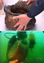中国云南抚仙湖水下考古的队员们六月三日九时许,在水下考古现场发现一个陶器,并将这个陶器运出水面进行研究分析,有专家认为这是汉代的“釜”(锅),是一种生活用具。