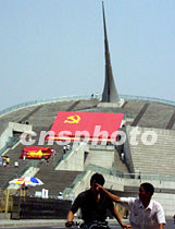 为纪念中国共产党建党八十周年,北京中华世纪坛上新近展示出的巨幅中国共产党党旗十分鲜艳醒目。中新社图 邹宪 摄