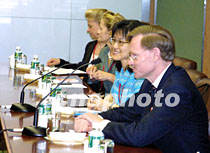 石广生会见美贸易代表 双方还将进一步商议 2001年6月5日 15:44 ![]() 石广生与美国贸易谈判代表罗伯特·佐立克一行会晤。中新社记者 潘索菲 摄 ![]() 二○○一年APEC贸易部长会议将于六月六日开幕。会议主席、中国外经贸部部长石广生和中国代表团团长、外经贸部首席谈判代表龙永图,五日在上海国际会议中心与经济体代表团团长举行双边会谈。图为美国贸易谈判代表罗伯特·佐立克。中新社记者 潘索菲 摄