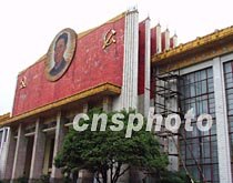中国共产党成立八十周年前夕,雕有毛泽东青年时期巨幅头像的湖南省长沙市博物馆加紧对外壁的大规模装修。中新社图 郑萍萍 摄