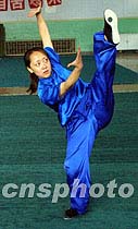 第三届世界武术锦标赛剑术冠军周淑红为“万里行”车队表演一套八卦拳,以表达自己对北京举办奥运会的的热切期盼。中新社图 魏孝明 摄