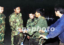 浙江省玉环县的巡逻队员夜间在刑事案件多发地段巡查。这支在“严打”中协助警方治理社会治安的夜巡队伍,已抓获犯罪嫌疑人六百五十六名,协助警方破案一百五十四起。中新社图 於建伟 摄