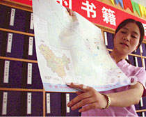 韶山新华书店的工作人员将一幅韶山市地图倒置,“瞧,韶山地图象不象中国地图?”因诞生伟人毛泽东而闻名于世的湖南韶山,是众多中国人心目中的圣地,韶山人更是以此为荣。中新社记者 郑萍萍 摄