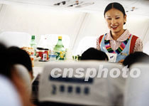 藏族空姐卓嘎日前在飞越青藏高原的“空中客车”上,为北京——拉萨航线的乘客提供细致周到的服务,让乘客尽早地感受到西藏气息。飞行青藏高原的西南航空公司目前已经录用了十五名藏族空姐。中新社记者 满会乔 摄