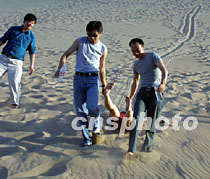 凤凰卫视编导李哲小姐虽发扬“不怕苦不怕累”的精神,但终因体力不支,在沙坡上累倒了。图为队友把她从坡上“拖”下来的情景。中新社图 魏孝明 摄