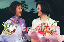 北京军区政治部战友京剧团为建党八十周年,十四日晚为北京的京剧爱好者献上了一台现代京剧《杜鹃山》,图为演出结束后著名京剧表演艺术家原柯湘的扮演者杨春霞(右)向本剧柯湘的扮演者于兰(左)表示祝贺。中新社图 张勤 摄