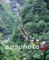 中国江西井冈山革命胜地,现在已成为旅游者的好去处,周末远来游客乘缆车穿梭于茂密的丛林与山谷之间,其乐融融。中新社记者 王丽南 摄