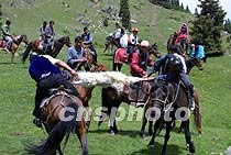 在天池边的一片草坡上,牧民骑马叨羊,用富有特色的民族体育形式表达对北京申奥的支持。中新社图 魏孝明 摄