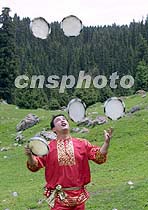 哈萨克艺人表演民族杂技,五个手鼓在空中飞舞,形如五环交叠,预祝北京好运。中新社图 魏孝明 摄