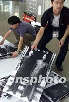 即将于二十日在北京开幕的建党80周年图片展,汇集了大量的珍贵历史图片,工作人员正准备悬挂一幅毛泽东1945年赴重庆谈判时与蒋介石合影的照片。中新社记者 满会乔 摄