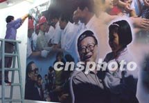 中共建党80周年图片展即将于二十日在北京中国革命博物馆开幕,工人正在认真张贴一幅有国家主席江泽民形象的照片。中新社记者 满会乔 摄