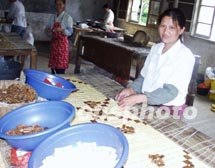 旅游使井冈山的自然资源得到充分利用,有头脑的井冈山人将这里的毛竹加工成竹席、竹鞋等各种物品销售,成了当地先富起来的人。图为一家私人手工竹席加工场的女工正在作业。中新社记者 王丽南 摄