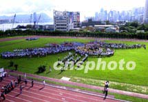 为支持北京申办2008年奥运会,两千多名香港市民周日在蓝天白云映照下的香港湾仔运动场草坪上组成“北京申办2008年奥运会标志”图案。中新社记者 任晨鸣 摄