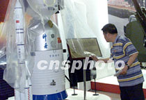 图:“神舟”飞船模型亮相建党图片展 2001年06月18日 17:08 ![]() 一九九九年飞行试验取得圆满成功的“神舟”飞船模型即将在20日开幕的中共建党80周年图片展亮相。中国第一艘无人太空船“神舟号”试飞成功是中国航天史上一项重要的里程碑,同时也标志着中国将进入载人航天时代。中新社记者 满会乔 摄