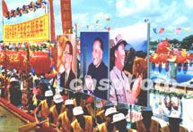 图:侨乡阳江龙舟竞渡颂党恩迎九运 2001年06月23日 19:12 ![]() 广东阳江日前举行“君悦杯”龙舟锦标赛,比赛除传统龙舟和国际龙舟竞渡外,还有令人眼花缭乱的彩龙竞艳巡游,近十万市民冒着酷热争睹观看。 图为 以歌颂中国共产党建党八十周年光辉业绩为主题的彩色龙舟。中新社图 龙土有 摄
