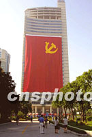 图:巨幅党旗悬挂在上海市中心 2001年07月01日 18:21 ![]() 一幅长八十米的巨幅党旗七月一日被悬挂在上海市中心的上海电视台大厦上,受到路人的注目。中新社记者 潘索菲 摄