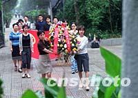 国家开发银行的青年们周末来到北京万安公墓,向中国共产党的创始人李大钊塑像敬献花圈。中新社记者 史利 摄