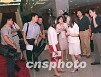 图:中外媒体记者在北京采访中日贸易磋商 2001年07月03日 19:17 ![]() 在北京的中外媒体记者三日下午在中国外经贸部谈判大楼采访“中日贸易磨擦问题正式磋商”。中新社记者 邹宪 摄