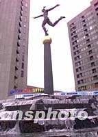 7月10日,在莫斯科世贸中心酒店前的阶梯喷泉开始喷水,迎接将于12日召开的国际奥委会112次会议。中新社记者 王瑶 摄